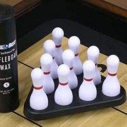 This bowling kit provides everything you need to bowl on your home shuffleboard. 10 Pin Set with Pin Setter and a can of Shuffleboard wax with a number 1 out of 5 Speed rating. The game is played using your existing shuffleboard pucks. It’s a great way to add more entertainment to your game room at minimal expense. Free and Fast Shipping! Need a shuffleboard. Check out our 9′ and 12′ Shuffleboards