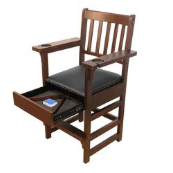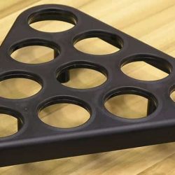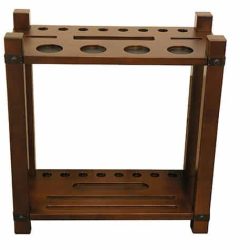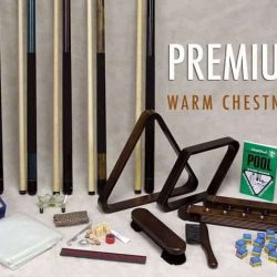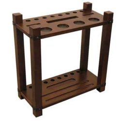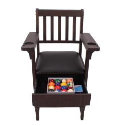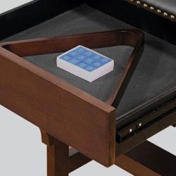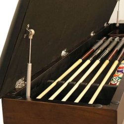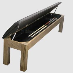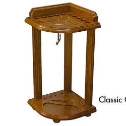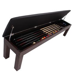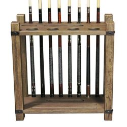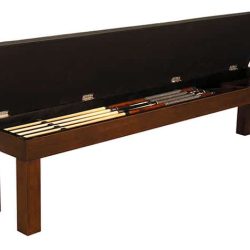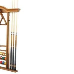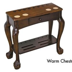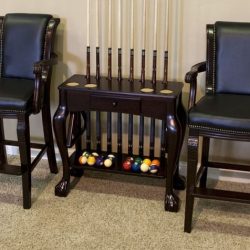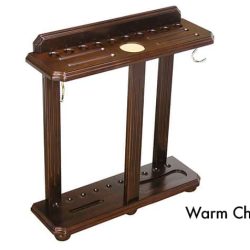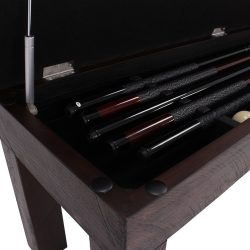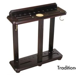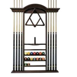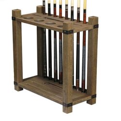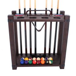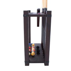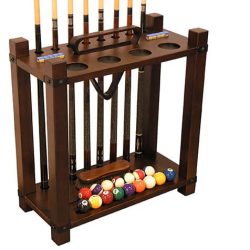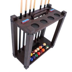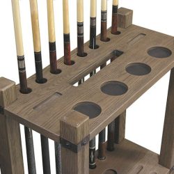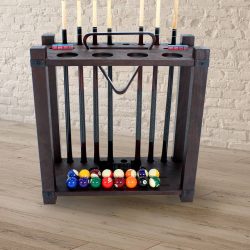 • Holds 10 cues and accommodates a set of balls, 2 ball racks, chalk, table brush, and a recessed cork coaster