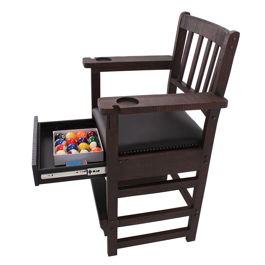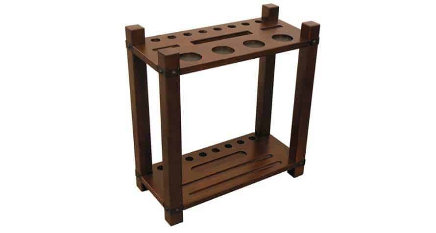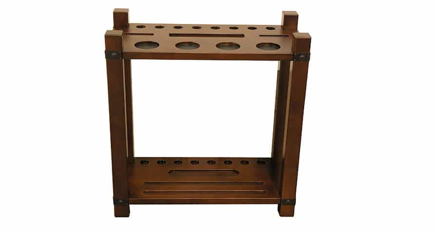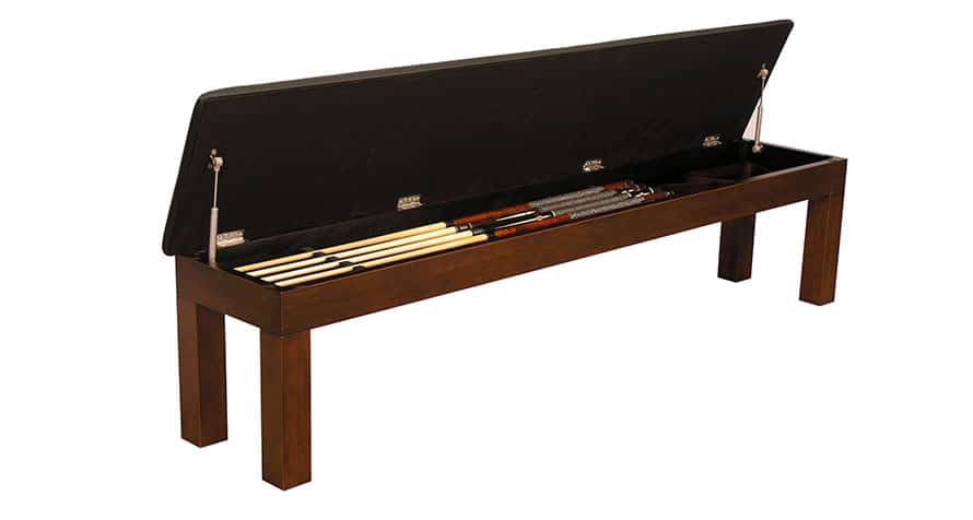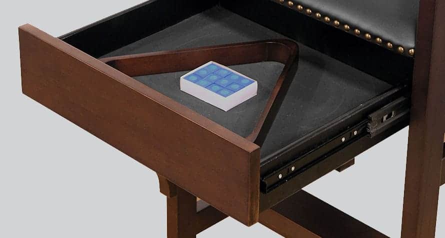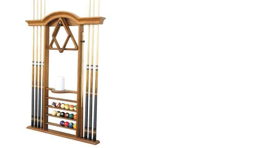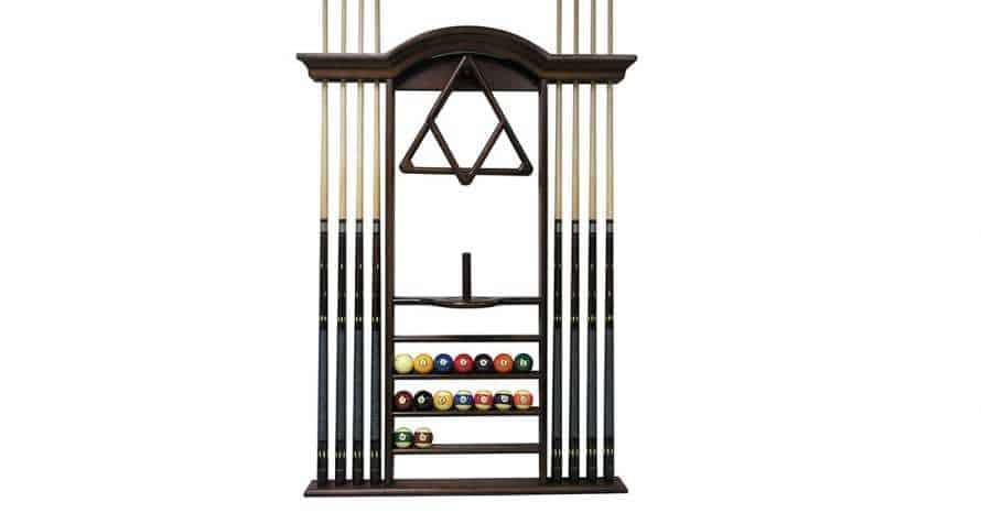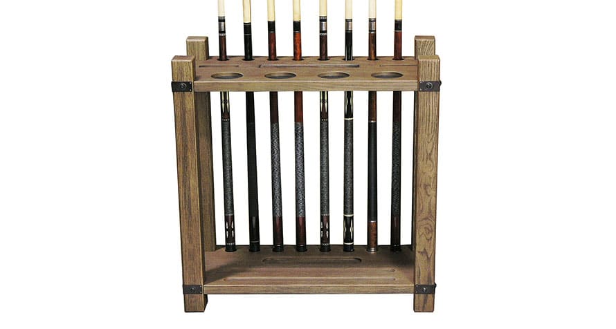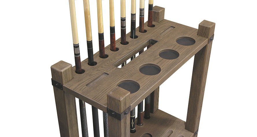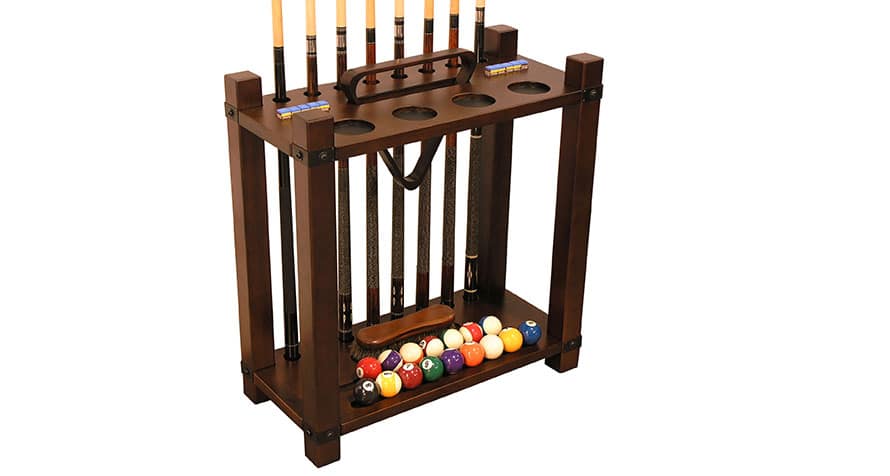 • Holds 10 cues and accommodates a set of balls, 2 ball racks, chalk, table brush, and a recessed cork coaster